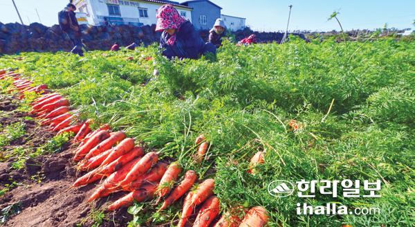 24일 제주시 구좌읍의 한 밭에서 농민들이 당근을 수확하고 있다. 이상국기자