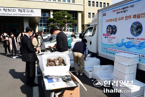 지난 10월 27일 도교육청에서 진행된 뿔소라 소비촉진 공동구매행사. 사진=제주도교육청 제공