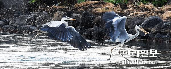 26일 제주시 구좌읍 행원리 광어양식단지 부근에서 왜가리들이 먹잇감을 차지하기 위한 추격전을 벌이고 있다. 이상국기자