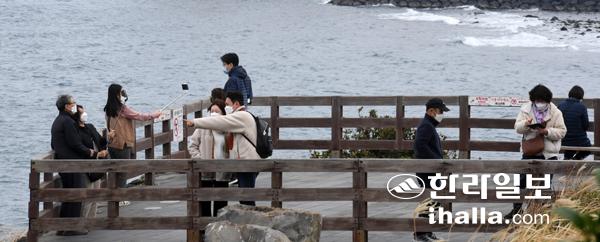 26일 제주시 용담동 용두암을 찾은 관광객들이 제주 바다의 정취를 카메라에 담고 있다. 이상국기자