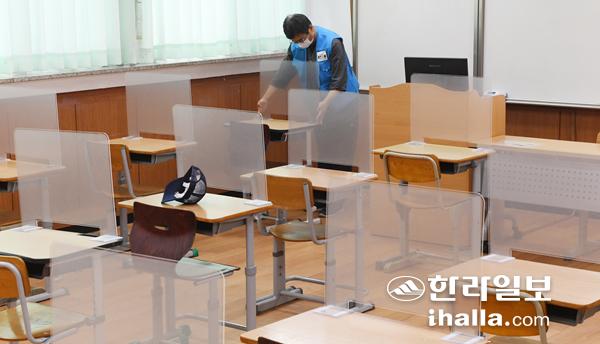 27일 올해 수능이 치러지는 시험장 중 하나인 제주고등학교에서 칸막이 설치 작업이 진행되고 있다. 이상국기자