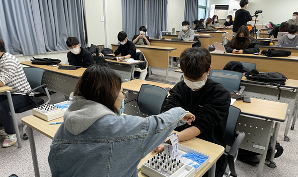 제주대 환경보건센터 연구원들이 삼나무 알레르기 피부 단자를 검사하고 있다.