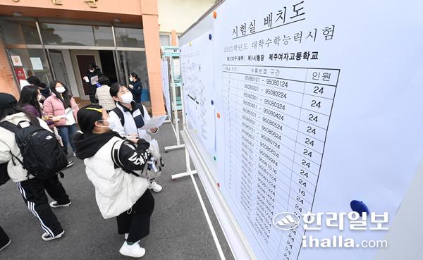 2021학년도 대학수학능력시험 예비소집일이자 수능을 하루 앞둔 2일 오후 제주여자고등학교에서 수험생들이 자신의 시험장을 확인하고 있다. 이상국기자