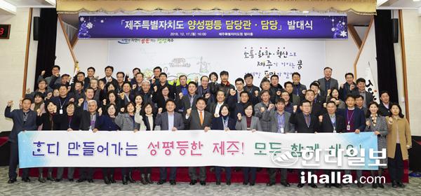 제주특별자치도는 전국 지방자치단체 최초로 성평등 정책 추진 부서인 '성평등정책관'을 신설한데 이어, 양성평등담당관 및 담당을 지정해 성인지 정책 추진에 박차를 가하고 있다. 사진은 2018년 12월 열린 양성평등 담당관·담당 발대식. 사진=제주도 제공