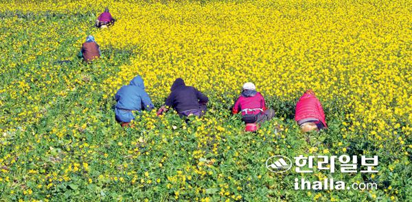 7일 제주시 구좌읍 종달리 한 농경지에서 농민들이 유채꽃 향기를 맡으며 무 수확작업을 하고 있다. 강희만기자
