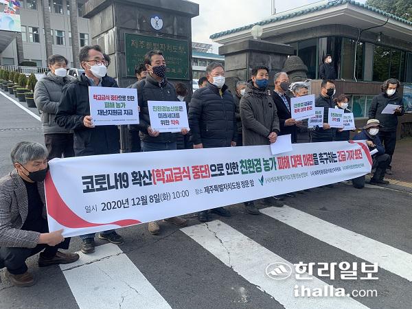 (사)제주도친환경농업협회 등 농업단체들은 8일 제주도청 앞에서 학교급식 중단·축소에 따른 대책을 요구했다. 송은범기자