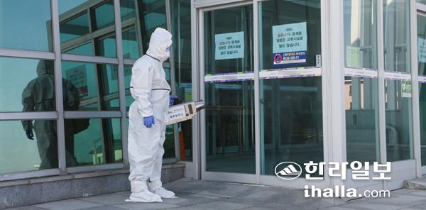 9일 제주시내 한 교회에서 코로나19 확진자가 발생한 가운데 방역요원들이 해당 교회를 폐쇄하고 방역작업을 하고 있다. 이상국기자