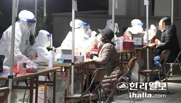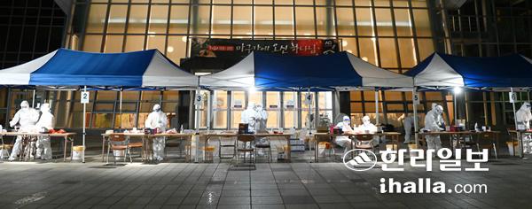 제주자치도가 10일 제주성안교회에 설치한 임시 선별진료소에서 교인들이 코로나19 검체를 채취하고 있다. 이상국기자