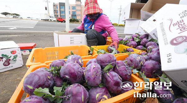 10일 제주시 한림읍 한 밭에서 수확철을 맞은 콜라비를 수확해 포장하는 작업으로 농민이 분주한 시간을 보내고 있다. 이상국기자