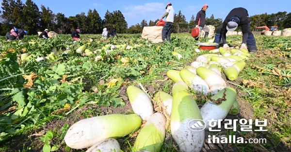 지난 12일 서귀포시 표선면 한 밭에서 농민들이 월동무를 수확하며 분주한 시간을 보내고 있다. 이상국기자