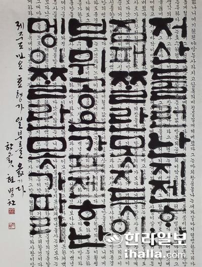 현병찬(1942~ )은 제주시 화북2동에서 태어나 초등교장으로 퇴임을 했다. 어릴 때부터 그림에 재능이 있었고 한문 서예도 공부했으나 일생을 한글 서예에 몸 담았다. 제주인으로서는 대한민국서예대전 한글부문 대상을 수상했다. 한글로 전국에 제주문화를 알린 공로가 크다. 현병찬의 살아온 길을 돌아보면, 평생을 성실하게 살았다는 것을 글씨가 말해준다. 궁체와 판본체가 보여주듯이 "부지런한 공(功)은 싯나(있다)"였고, 땐 굴뚝이었기 때문에 따뜻해지고 연기가 나는 법이다. "먹돌도 똘람시민 고망나고" "천리길도 꼬닥 꼬닥 한 걸음부터" 시작된다. 한글 글씨의 내용도 폭이 넓었다. 노자·중용·주자·도연명에서 마태복음·톨스토이까지, 용비어천가에서 주시경까지, 이규보·서경덕·정철·박목월·도종환·김순이·채바다 등 현대시인들, 곶자왈·바릇궤기·비바리 등 제주의 용어까지, 그리고 제주 노동요·속담·교훈까지 한글 서예의 지평을 넓히고 형식 실험도 마다하지 않고 있다. 재미있는 것은 단어의 어감과 의미와 뜻을 연상하면서 글씨를 쓰는데, 의미를 밝히기 위해 형상을 그린다는 것이다. 이것은 그림 글씨이자 글씨 그림인 셈이다. 원래 글씨와 그림은 한 몸이었다. 한자의 상형의 예가 바로 그것을 말해주며, 한글 또한 천지인의 우주관에서 탄생한 것을 말 할 수 있다.