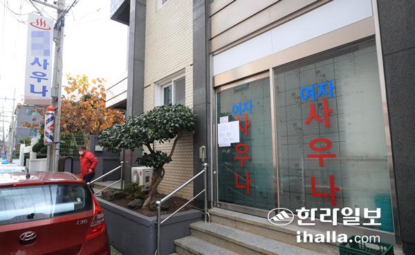집단감염 발생으로 폐쇄된 제주시 중앙로에 위치한 한라사우나. 연합뉴스