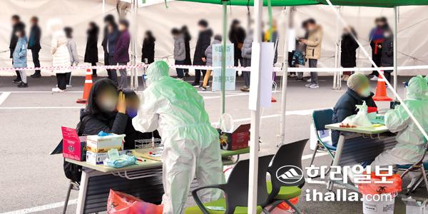 코로나19 지역사회 집단감염이 급증하면서 휴일인 20일 제주보건소 선별진료소에는 진단검사를 받으려는 사람들이 하루종일 이어졌다. 강희만기자
