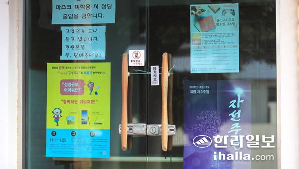 코로나19 확진자 발생으로 임시 폐쇄된 제주시 구좌읍 김녕성당.