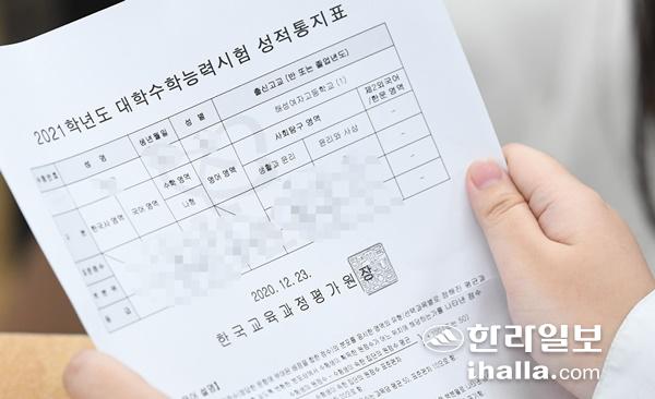 23일 오전 학생들이 2021학년도 대학수학능력시험 성적표를 확인하고 있다. 연합뉴스