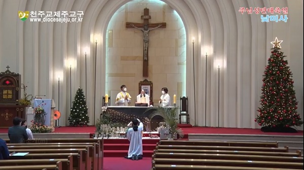 천주교제주교구는 25일 오전 11시부터 중앙주교좌성당에서 열린 성탄 대축일 낮미사를 제주교구 유튜브 채널을 이용해 생중계했다. 이날 성탄 미사는 제주중앙성당 현경훈 신부가 집전했다.