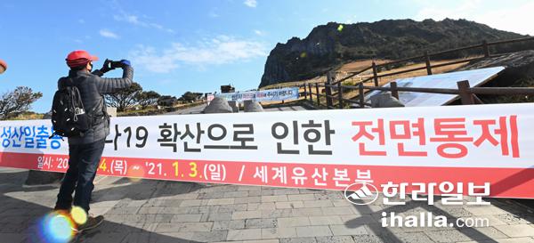 코로나19 확산으로 전면 통제된 성산일출봉 입구에서 26일 한 관광객이 탐방을 하지 못하는 아쉬움을 달래며 일출봉 풍경을 사진에 담고 있다. 이상국기자