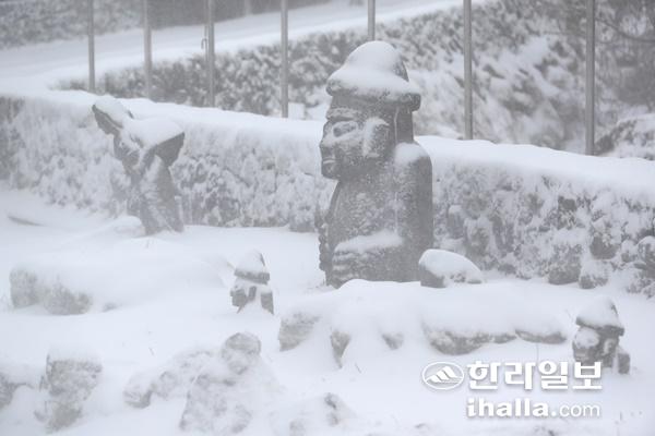 제주도 산간에 대설경보가 내려진 30일 오전 제주시의 한 중산간도로변에 세워진 돌하르방이 하얀 눈을 뒤집어 쓰고 있다. 연합뉴스