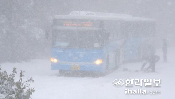 제주도 산간에 대설경보가 내려진 30일 오전 제주시 516도로를 지나던 버스들이 운행을 중단한 채 서 있다. 연합뉴스