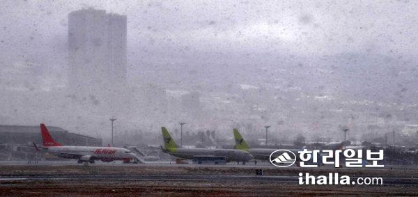 30일 제주 전역에 내린 폭설에 강풍까지 동반돼 비행편이 결항·지연되고 있다. 강희만기자