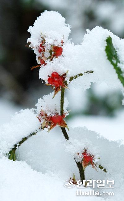 지난 2일 서귀포시 난대·아열대산림연구소 한남시험림에서 제주 자생종인 겨울딸기 열매가 수북이 쌓인 눈 속을 뚫고 탐스러운 얼굴을 내밀었다. 사진=난대·아열대산림연구소 제공