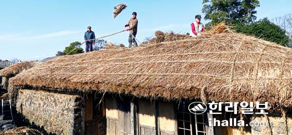 서귀포시 표선면 성읍마을 주민들이 4일 초가 지붕 집줄매기 작업을 하고 있다. 이상국기자