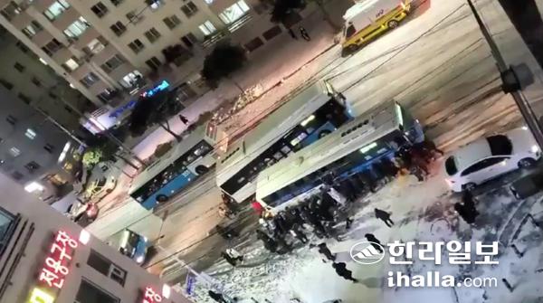지난달 30일 저녁 제주시 이도2동 고산동산 오르막길에서 버스가 뒤로 미끄러지는 아찔한 상황에서 시민들이 막아서고 있다. 독자 제공