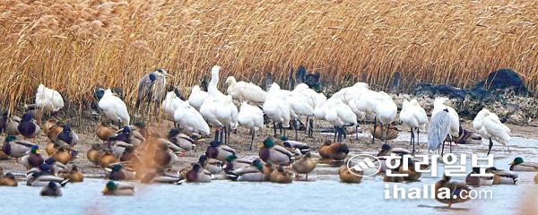 5일 제주시 구좌읍 하도리 철새도래지를 찾은 저어새(천연기념물 제205호)들이 청둥오리와 함께 휴식을 하고 있다. 강희만기자