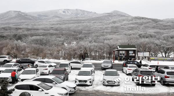 5일 한라산 1100고지 일대에 상고대가 핀 가운데 영실분화구를 배경으로 한 설경이 장관을 연출하고 있다. 이상국기자