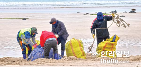 5일 제주시 구좌읍 월정해수욕장에서 바다환경지킴이들이 모래속에 묻혀 있던 쓰레기를 수거하고 있다. 강희만기자