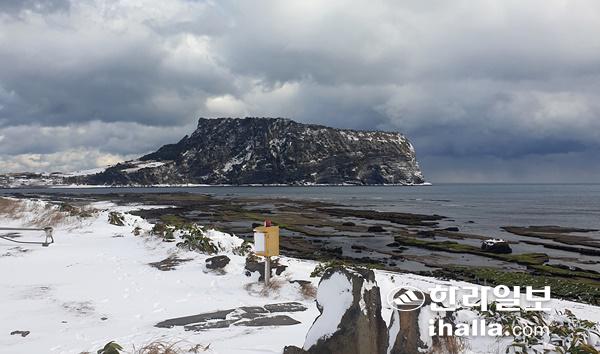 한파가 몰아닥친 8일 제주 서귀포시 성산일출봉에 눈이 쌓여 있다. 연합뉴스