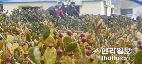 10일 제주시 한림읍 월령리 선인장마을을 찾은 관광객들이 보랏빛 백년초 열매를 감상하고 있다. 이상국기자