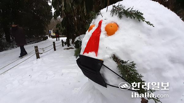11일 제주시 한라수목원 내에 마스크를 쓴 눈사람이 오가는 탐방객들의 눈길을 끌고 있다. 강희만기자