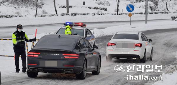 11일 오후부터 제주지방에 대설주의보가 내려지면서 12일 오전 한라산을 횡단하는 516도로 운행이 통제되고 있다. 강희만기자