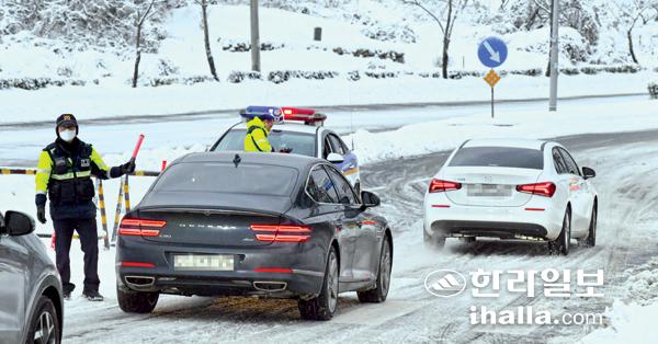 산지에 눈이 계속 내리고 있는 가운데 경찰이 12일 제주시와 서귀포시를 잇는 5·16도로를 통제하고 있다. 강희만기자