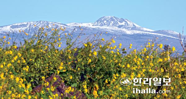 16일 서귀포시 예례동 해안에서 바라본 한라산 만설이 유채꽃과 어우러져 장관을 연출하고 있다. 강희만기자