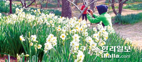 18일 제주시 한림공원 내에 수선화가 만개해 관광객들이 기념사진을 찍으며 즐거운 시간을 보내고 있다. 이상국기자
