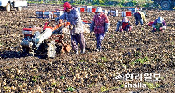 19일 서귀포시 대정읍 하모리의 한 농경지에서 농민들이 겨울 감자 수확작업을 하고 있다. 강희만기자