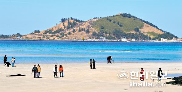 푸른 하늘이 드러나며 맑은 날씨를 보인 20일 제주시 한림읍 협재해수욕장을 찾은 관광객들이 제주 겨울바다를 즐기고 있다. 강희만기자
