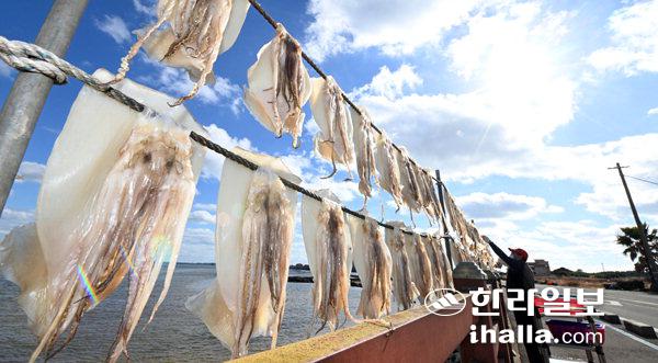 맑은 날씨를 보인 20일 서귀포시 성산읍 해안도로에서 오징어말리기 작업이 한창이다. 이상국기자