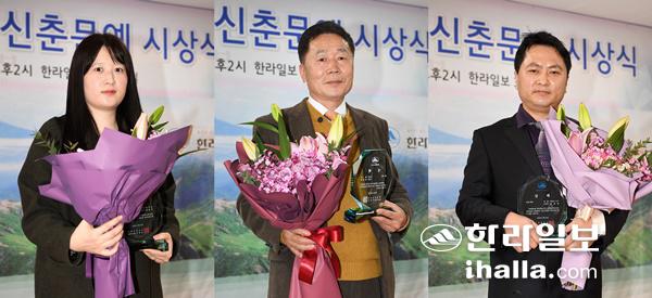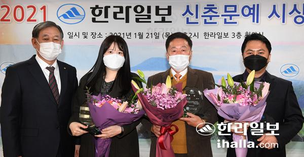 2021 한라일보 신춘문예 시상식이 21일 본사 회의실에서 열렸다. 왼쪽부터 수상자인 신윤주 시인, 김규학 시인, 차영일 소설가. 사진 촬영을 위해 잠시 마스크를 벗었다. 이상국기자