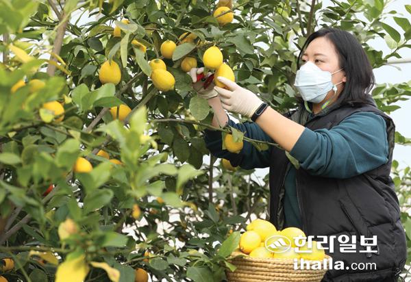 21일 서귀포시 남원읍 농촌진흥청 국립원예특작과학원 감귤연구소 재배지에서 연구원이 우리나라 1호 레몬 품종인 '제라몬' 열매를 수확하고 있다. '제라몬'은 외국산 레몬을 대체하기 위해 2019년 개발한 품종으로 지난해부터 농가에 묘목을 보급 중이다. 사진=농촌진흥청 제공