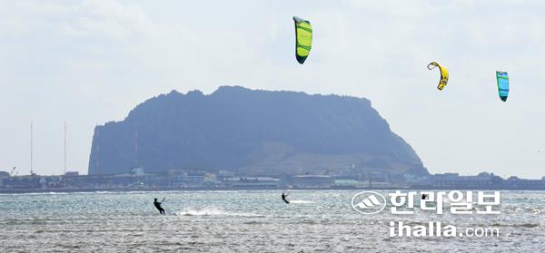 24일 제주시 구좌읍 종달리 앞바다에서 카이트서퍼들이 바람을 가르며 서핑을 즐기고 있다. 이상국기자