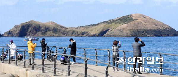 25일 제주시 한경면 자구내포구 인근 방파제에서 관광객들이 차귀도를 배경으로 기념사진을 찍고 있다. 이상국기자