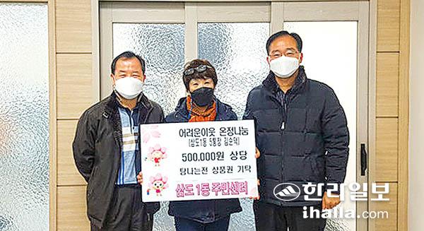 제주시 삼도1동(동장 강경필) 5통장 김순덕씨는 설 맞이에 앞서 삼도1동 관내 어려운 이웃을 위해 써달라며 탐나는전 상품권(50만원 상당)을 지난 25일 기탁했다. 삼도1동은 기탁받은 상품권을 관내 저소득가구 등 복지 취약가정에 전달할 예정이다.