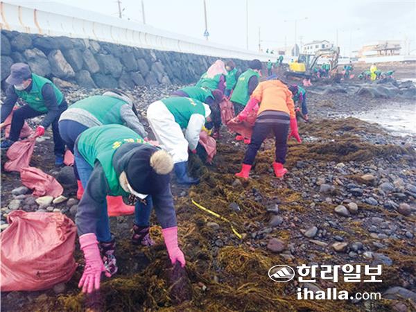 제주시 외도동(동장 한지연)과 새마을부녀회(회장 강길선)는 지난 24일 내도동 알작지 등 외도동 해안가에 서 괭생이모자반 수거작업을 벌여 32t을 수거했다.