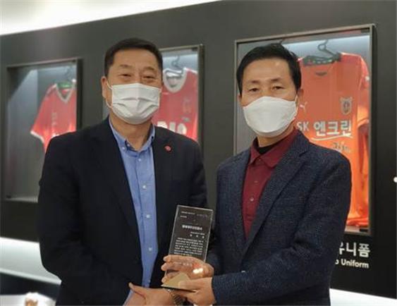 왼쪽부터 제주특별자치도 양홍식 해양수산국장과 한중길 제주유나이티드 대표이사. 사진=제주Utd 제공