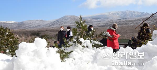 주말인 30일 1100고지를 찾은 관광객들이 한라산 상고대를 배경으로 기념사진을 찍고 있다. 이상국기자