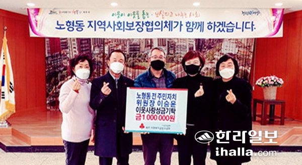제주시 노형동 지역사회보장협의체 이승윤 위원(사쿠라호텔 대표)은 지난달 29일 노형동 주민센터 2층 회의실에서 노형동지역사회보장협의체(위원장 문상수) 및 제주사회복지공동모금회(회장 김남식) 관계자가 참석한 가운데 설맞이 어려운 이웃돕기 성금 100만원을 기탁했다.