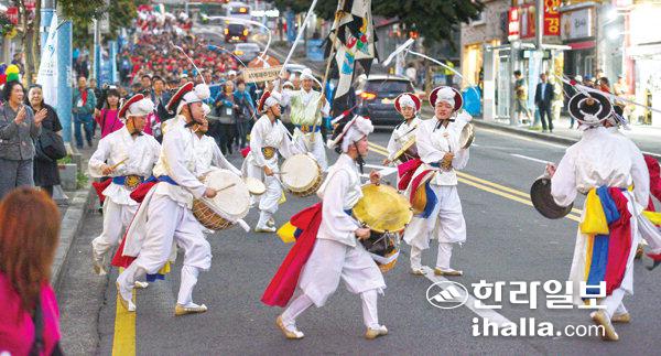 2019년 제주시 도심을 가득 채웠던 탐라문화제 거리 행렬. 코로나 시국으로 이젠 추억이 된 장면이다.
